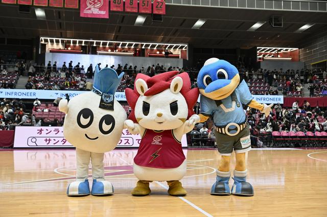 13日にはフロンターレのマスコット「ふろん太」と「カブレラ」が来場し、ブレイブサンダースのマスコット「ロウル」とともに会場を盛り上げた。14日にはフロンターレの佐々木旭選手と名願斗哉選手が応援に駆けつけ、ハーフタイムにはシュートチャレンジにも挑戦。サッカーボールを蹴って3ポイントシュートを狙う足技を披露した。