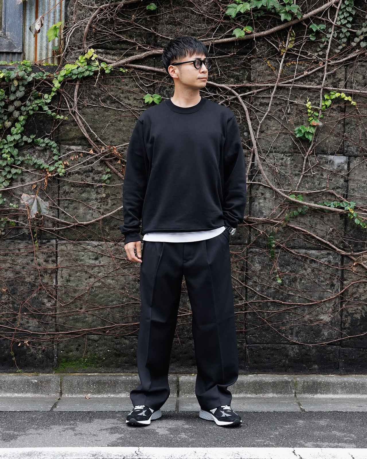 重ね着を決めるコツの一つが色の統一感です。トップス・ボトムス・シューズをブラックでまとめ、重ね着したインナーとシューズのソールにホワイトをチョイス。たったこれだけで、統一感のある上品なコーデに仕上がります。トップスとボトムスを程よいサイズ感にすることで、すっきりとした印象と若々しさを両立しているのもポイント。洗練された大人の印象と知性をアウトドアコーデで表現したい人にもおすすめの重ね着コーデです。