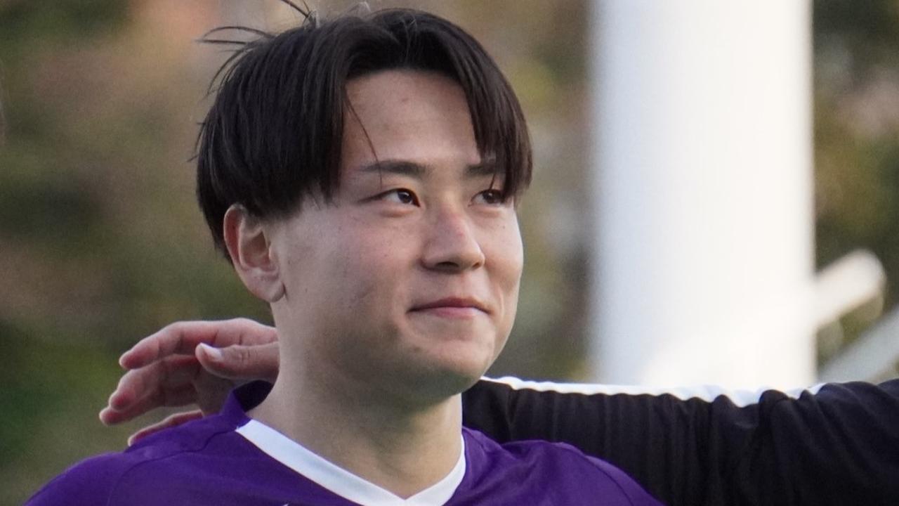 この日、2トップの一角で先発したFW真鍋隼虎(はやと、4年、名古屋グランパスU-18、J2藤枝MYFC入団内定)は、2ゴールを挙げる活躍でチームの逆転勝利に貢献した。